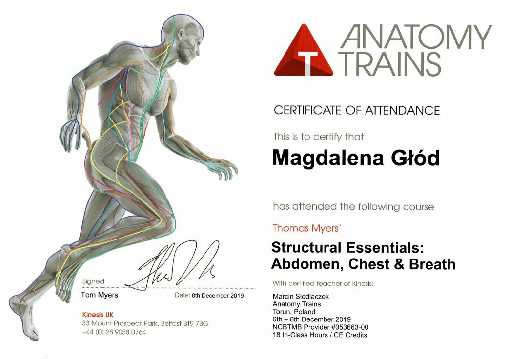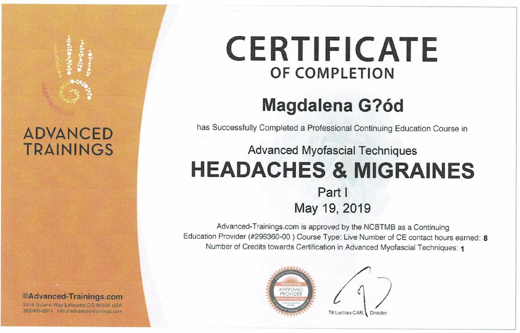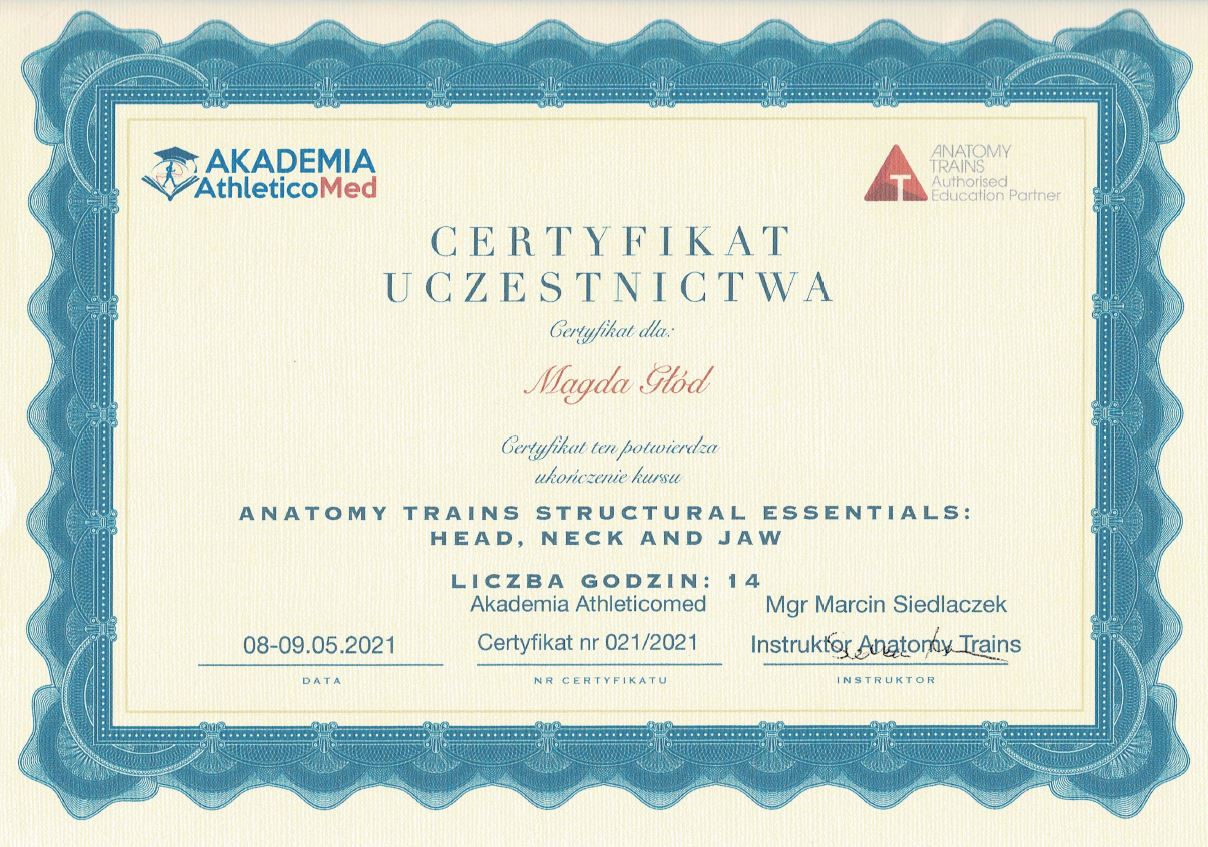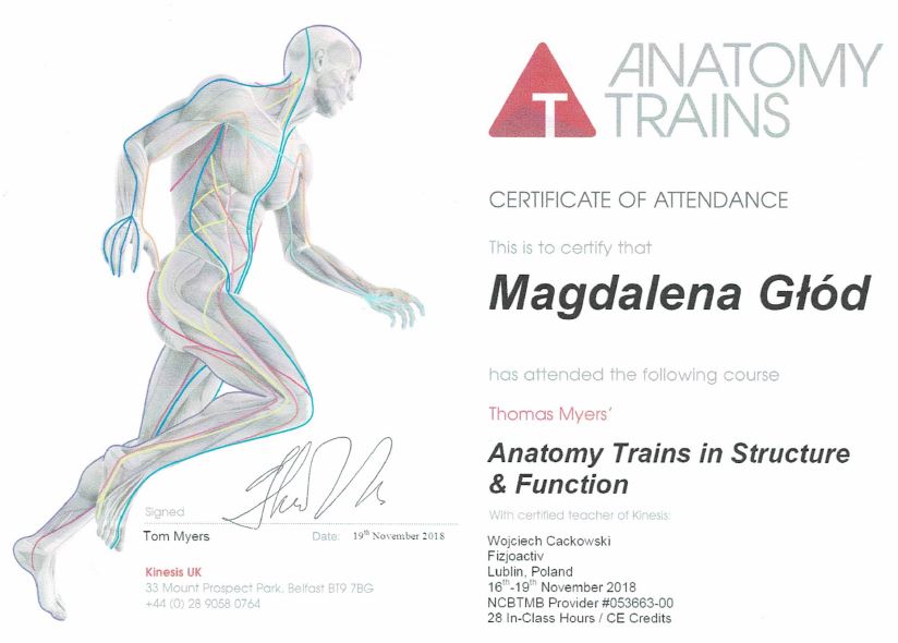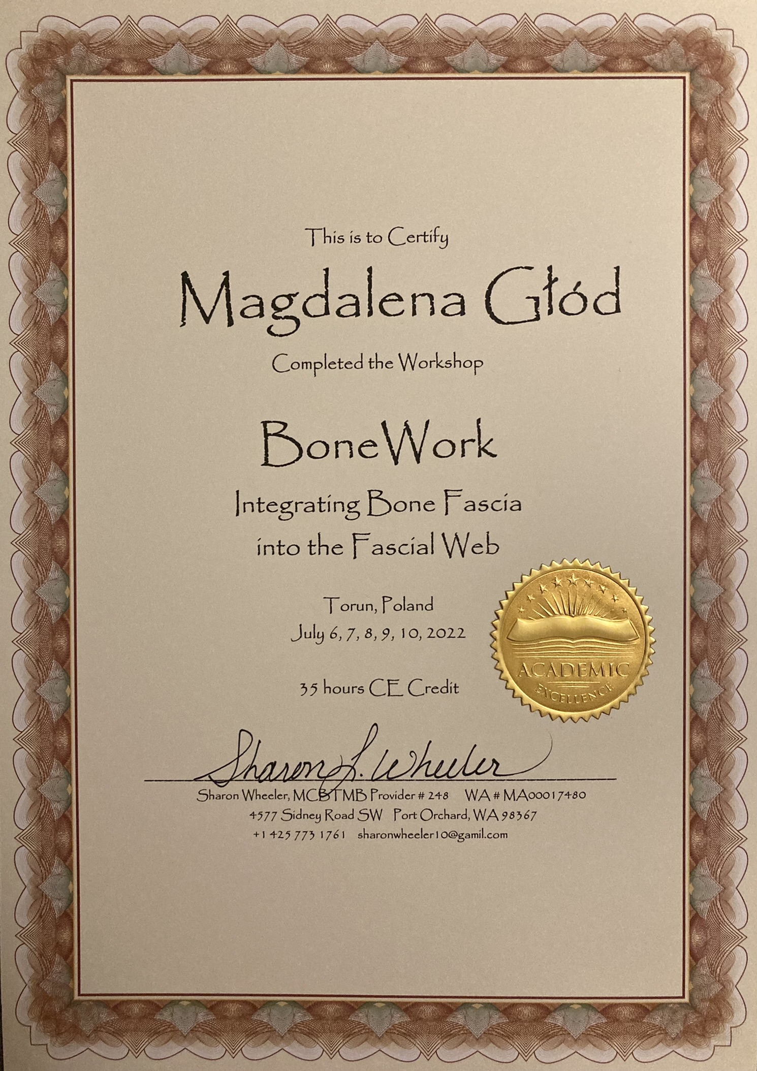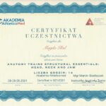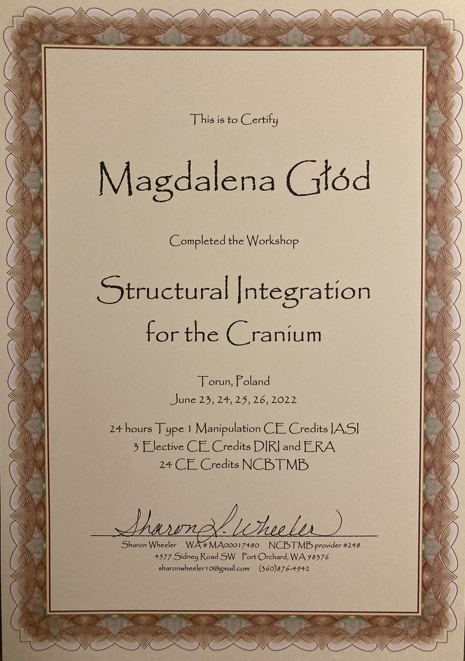 Ostatnie 5 lat mojego kształcenia to intensywny rozwój i praca metodami Anatomy Trains, Zoga, Zoga Face, ScarWork oraz Integracja Strukturalna Ciała i Czaszki.